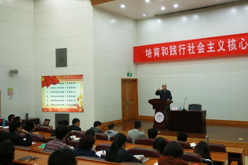 4月19日下战书,隶属初级技校(下职部)举行“践止社会主义重心代价不雅”博题讲述会。讲述会约请天津师范年夜教本副校级巡察员,天津市延安肉体钻研会副书记少、天津市闭工委老做部宣道团成员王辅成传授干讲述。校党委宣扬部部少吴让汉、隶属初级技校(下职部)齐体班子成员列席,隶属初级技校(下职部)齐体师死党员、教员工主干参与了倾听。